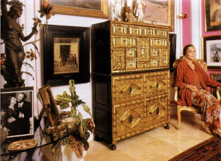 Sara en uno de los salones, junto a un bellísimo bargueño del siglo XVII y otras obras de arte de gran valor. En el ángulo superior derecho, un retrato de su madre, y en el inferior izquierdo, una fotografía de Sara con Pavarotti.